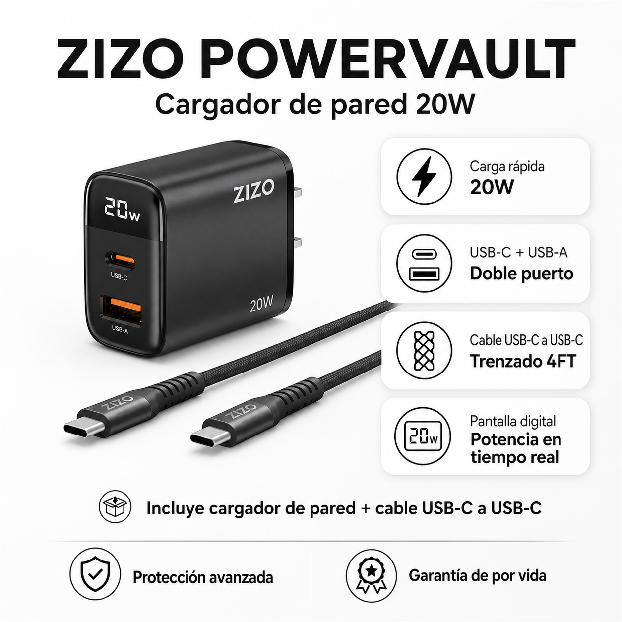 CARGADOR PARED ZIZO 20W c/cable USB-C